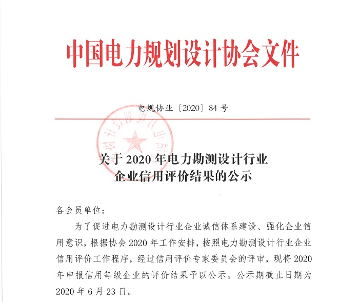 近日,中國(guó)電力規(guī)劃設(shè)計(jì)協(xié)會(huì)下發(fā)《關(guān)于2020年電力勘測(cè)設(shè)計(jì)行業(yè)企業(yè)信用評(píng)價(jià)結(jié)果公示》(電規(guī)協(xié)業(yè)[2020]84號(hào))文件,我公司在首次參報(bào)的“2020年電力勘測(cè)設(shè)計(jì)企業(yè)行業(yè)信用評(píng)價(jià)”中,榮獲AA級(jí)信用評(píng)價(jià)等級(jí),可喜可賀!