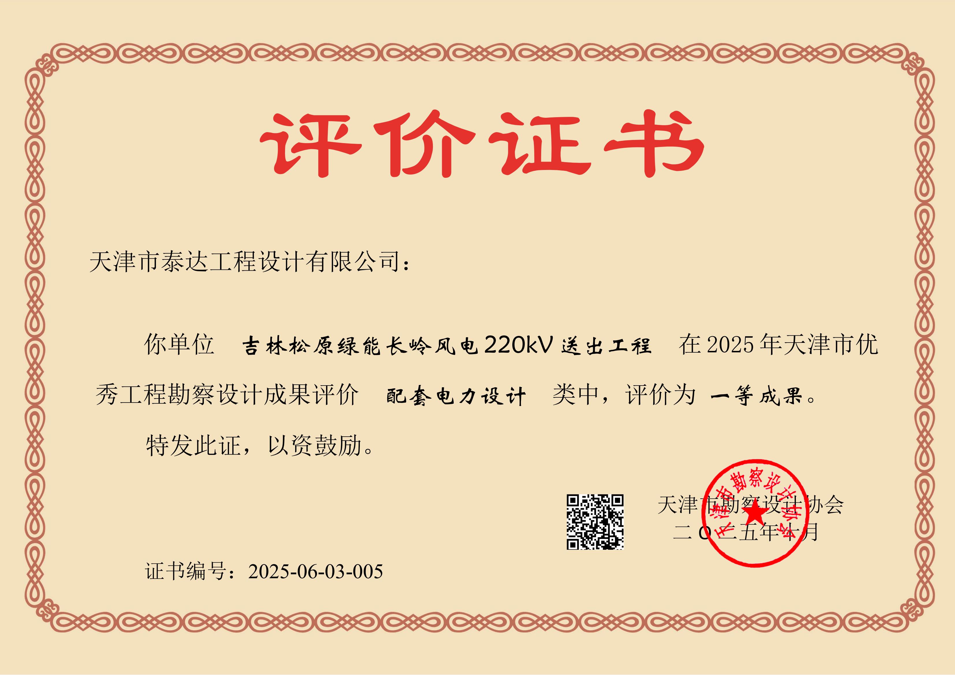 近日,2025年天津市優秀工程勘察設計成果評價結果正式公布,“吉林松原綠能長嶺風電220kV送出工程”和“國網天津濱海公司海洋高新區3#110千伏變電站電源線工程”分別榮獲配套電力設計類一等成果和三等成果,這是泰達設計連續第11年獲得此類獎項,彰顯了公司在電力勘察設計領域的專業實力與領先水平。